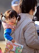 宮城県三陸町でおんぶされる女の子