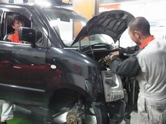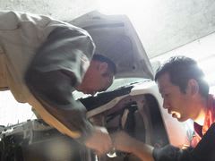 整備士田中君はワゴンRのお車のブレーキ整備中