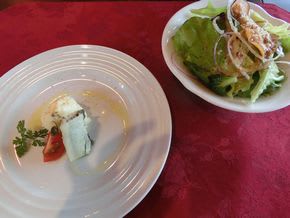 前菜はタラのオリーブ焼きとサラダ