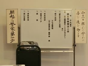 会場には「朝起きは繁栄の第一歩」