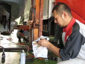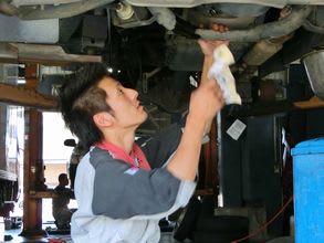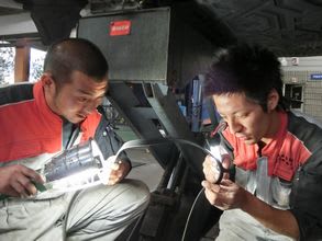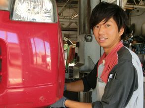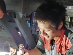 トラックのオイル交換中の中野君