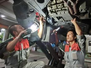 ベンツの下周りで作業をする田中君と中野君