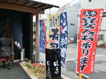 「ふぐ料理」「お寿司」などののぼりが並び