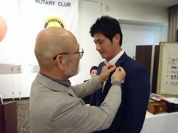 池北会長さんがロータリーバッヂをつけてくださいました