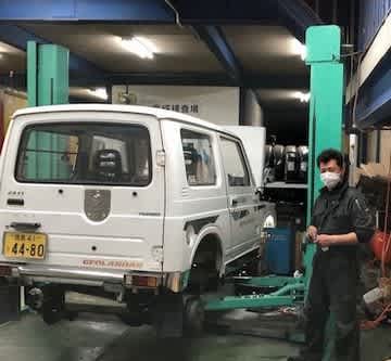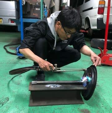 スタッフの田中一也君が自分の車の整備をしていました