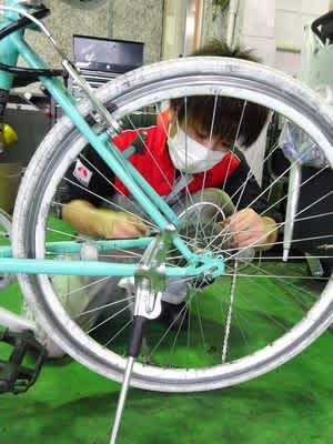 チェーンが外れて困っている方の自転車を修理中