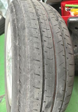 タイヤの角がすり減って、ワイヤーが見えてます
